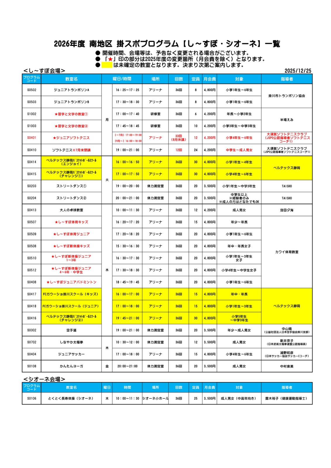2026年度の掛スポプログラムの一覧となりますのでご確認ください。