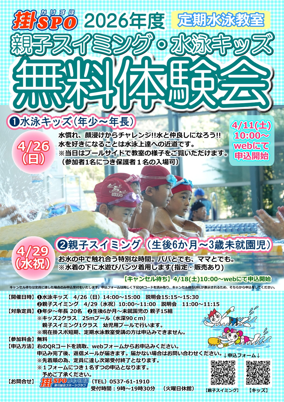 4/26(日)水泳キッズ(対象:年少~年長)&4/29(水・祝)親子スイミング(対象:生後6ヶ月~3歳未就園児)に無料体験会を開催します!