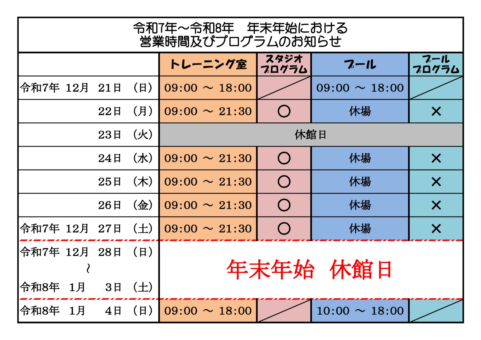 - 令和7年~令和8年 年末年始における営業時間及びプログラムのお知らせ