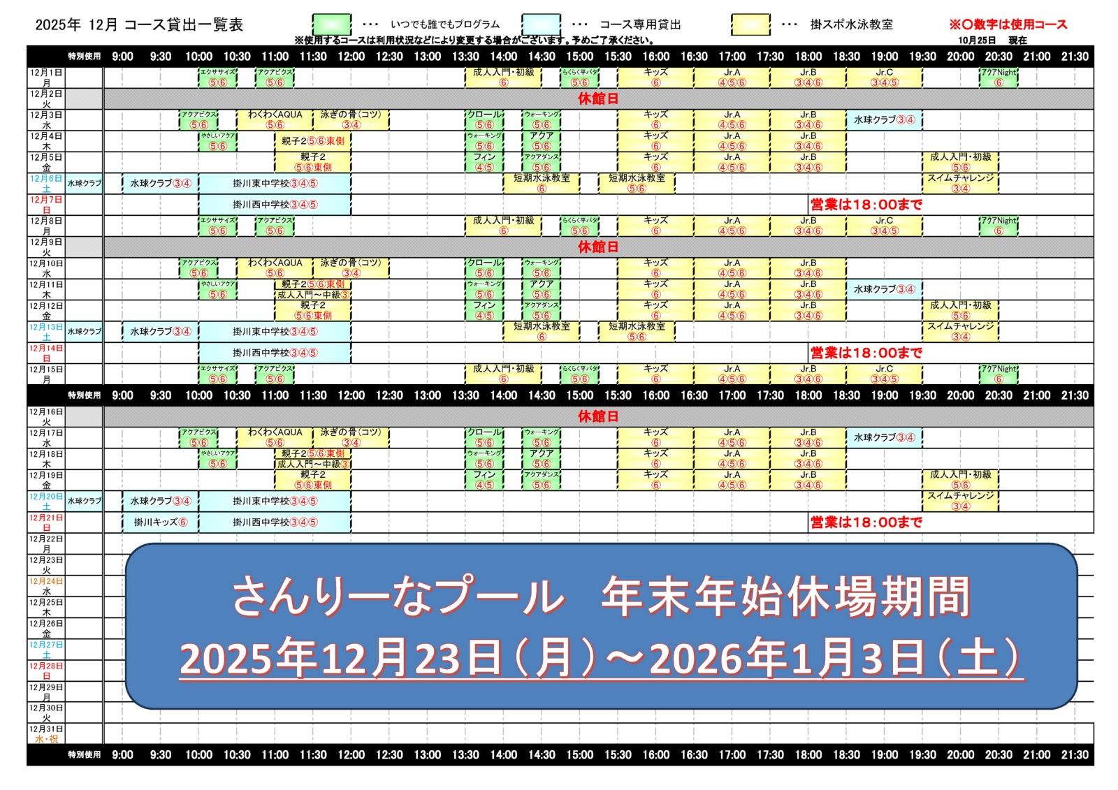 さんりーなプール令和7年12月コース貸出一覧・日程