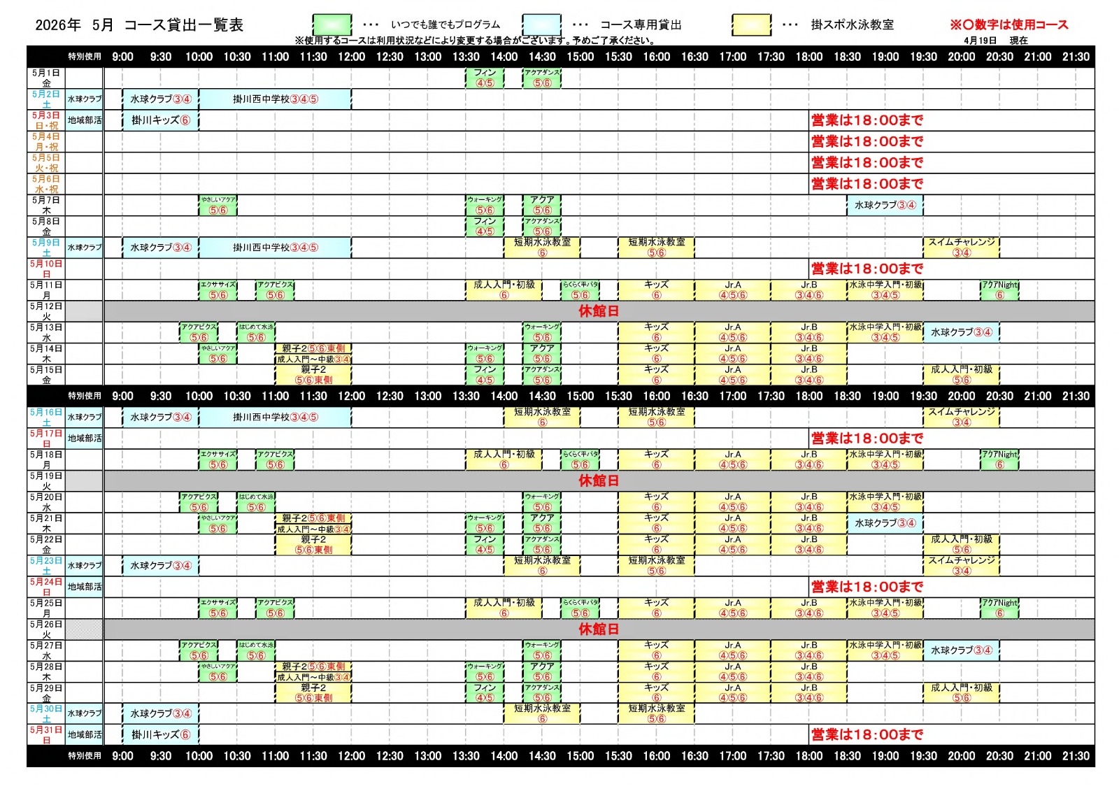 さんりーなプール令和8年5月コース貸出一覧・日程